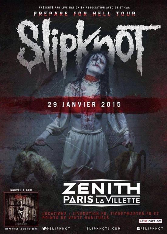 SLIPKNOT sera en concert à Paris (Zenith) le 29 Janvier 2015 à l'occasion du Prepare For Hell Tour. Les préventes débuteront le jeudi 16 Octobre de 10h à 18h sur www.livenation.fr . Les billets seront en vente à compter du vendredi 17 Octobre à 10h.